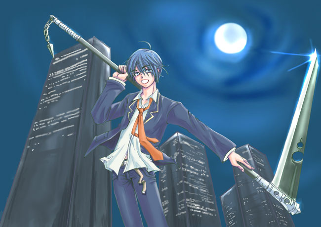 2006/03/13 ― 少年+デスサイズ ― 大鎌が武器って凄く燃えます。萌えでは無く燃え。 華奢な少女や少年が軽々ぶん回してればなお燃え。 まぁギャップに弱いって話。 やっと名前が決まったので今回登場のレン少年。 ちょいとカワイク描き過ぎたかもしれぬ。